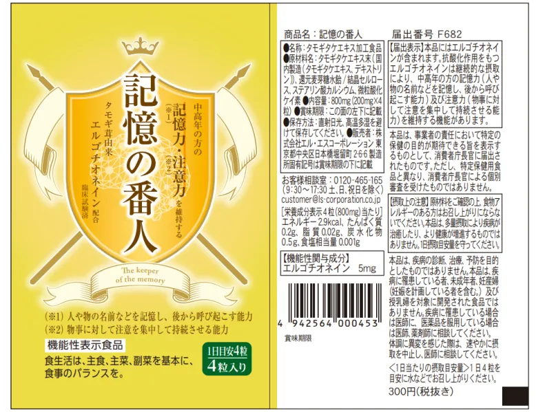 Suplemen Ergothioneine yang dilancarkan oleh LS Corporation Jepun adalah produk yang direka untuk menangani penurunan memori pada pertengahan umur dan orang tua.