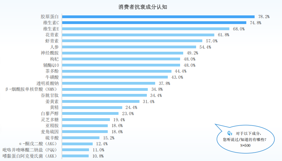 Terima kasih kepada pendidikan dan pembangunan pasaran, Collagen kini menjadi "bahan anti-penuaan" yang sangat diiktiraf di kalangan pengguna. Dalam tinjauan mengenai pemahaman bahan-bahan anti-penuaan arus perdana, kolagen (78.2%), vitamin C (74.8%), dan vitamin E (68%) adalah tiga bahan teratas yang dikenali sebagai pengguna untuk produk anti-penuaan oral. Di antara 5 persepsi ramuan anti-penuaan dalam kumpulan umur yang berlainan, kolagen tidak diragukan lagi "bahan bintang".